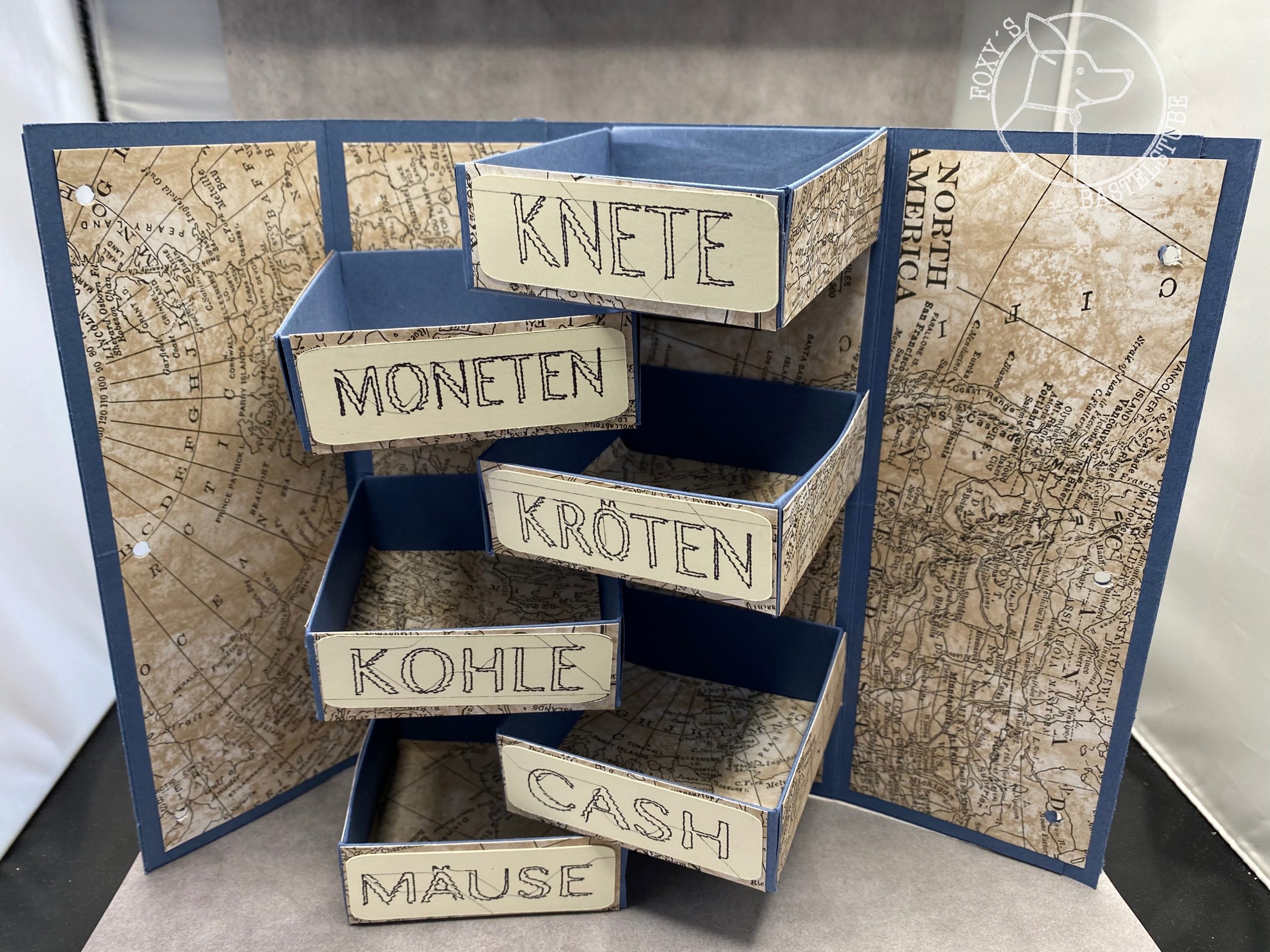 Ich habe mich an einer Verpackung versucht und einen Kartenturm für allerlei Kröten, Moos, Knete, Kohle, Mäuse und vieles mehr gemacht. Zum verschenken eignet es sich super für Männer oder Abenteuerlustige.