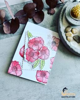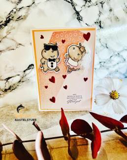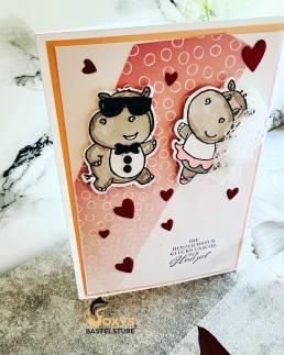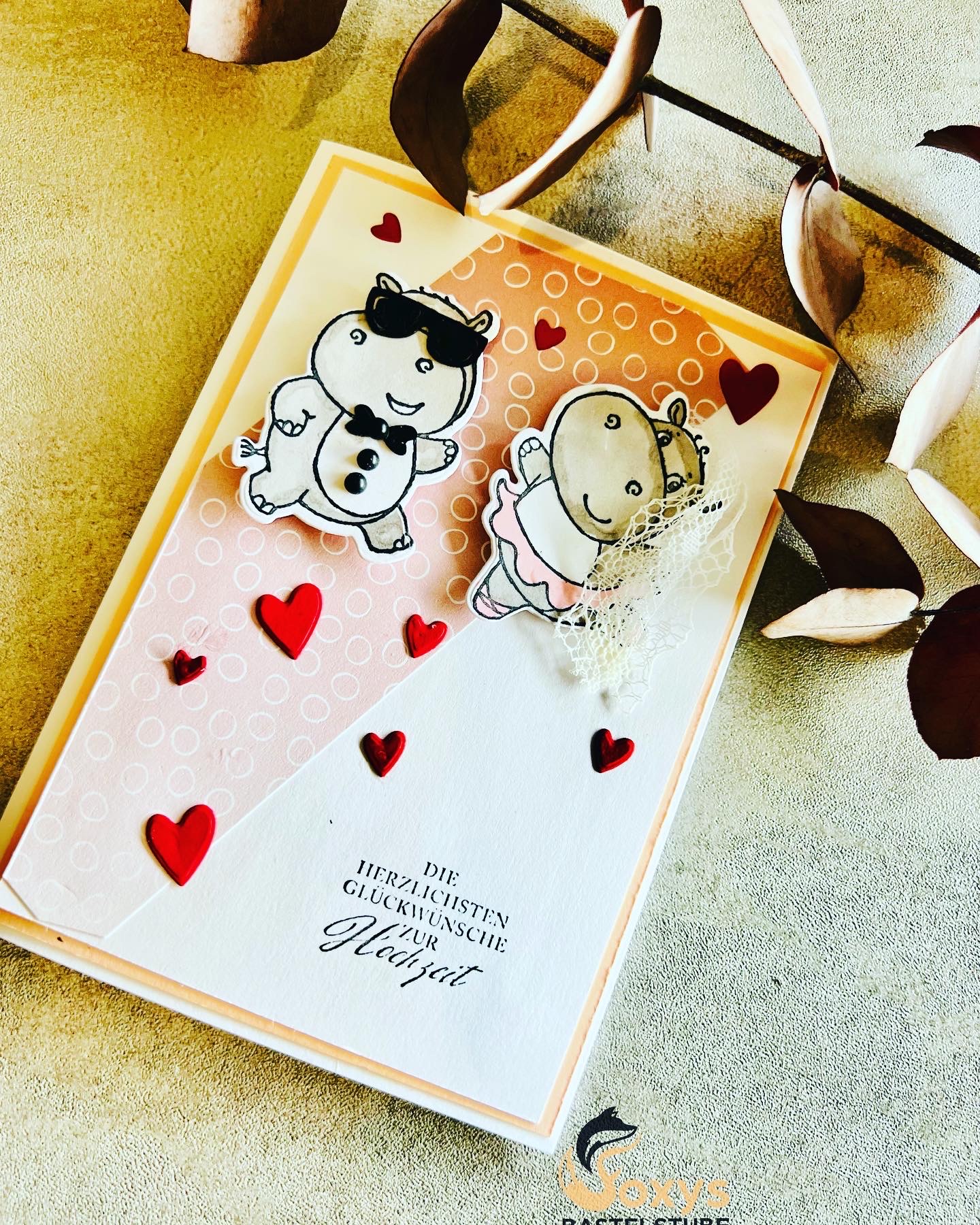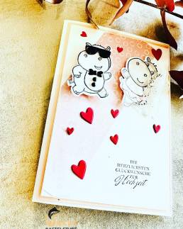 Und eine Hochzeitskarte ist aus dem wunderschönen Sale-A-Bration Stempelset die Hippos sind los entstanden. Im Hintergrund habe ich Kirschblüte benutzt und die Hippos wurden mit unseren Blends koloriert. Dazu kamen noch ein paar rote Herzen und den männlichen Hippo habe ich eine Sonnenbrille aufgesetzt. Der Schleier ist aus einem Stück Dekoband entstanden.Euch allen noch einen schönen Montagabend. Genießt das schöne Wetter.